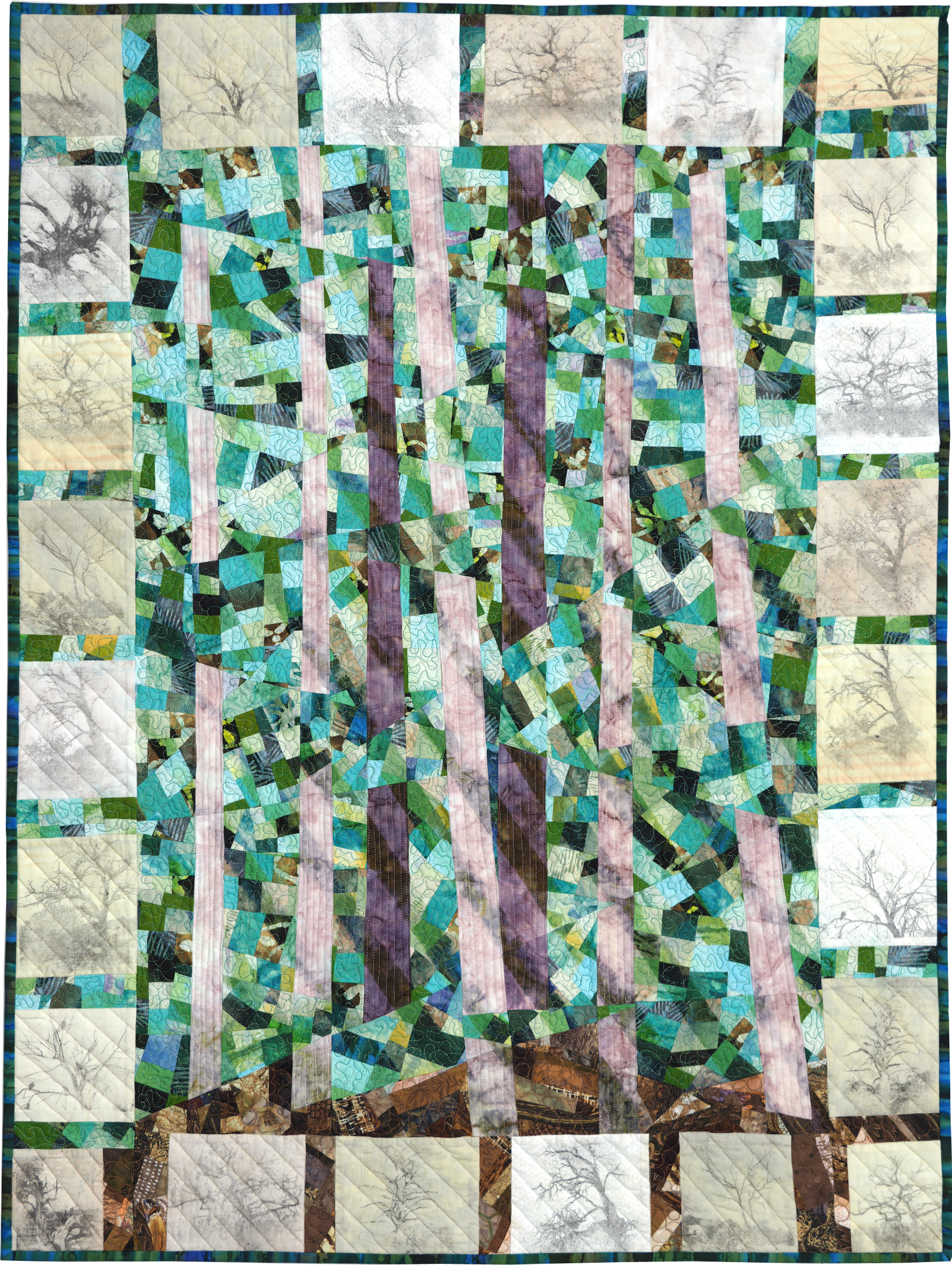 I seem to take a lot of pictures of old dead stumps and trees. Their interesting shapes and imagined history inspired this piece. I used small printed pictures and a printing technique using Citrosolv to transfer the images to fabric. The interior of the piece was improvisationally pieced on stabilizer.